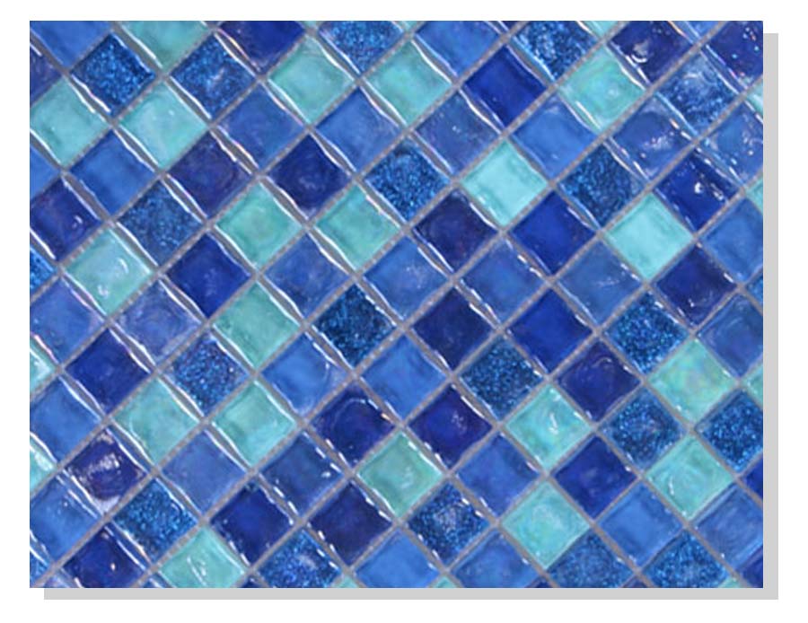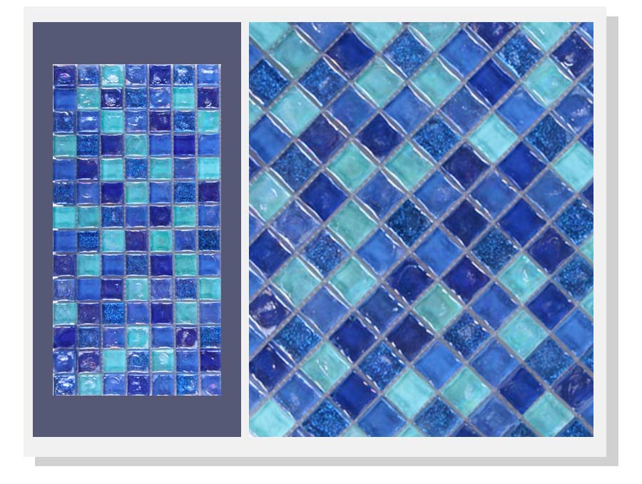 Glass mosaics are very popular for swimming pools, spas and water features. Glass mosaics offer incredibly wide colour and texture choices compared to ceramic mosaics. Our glass mosaics are available with transparent, gold, marbled and pearl effects. These tiles are perfect for either waterlines or for fully tiled pools