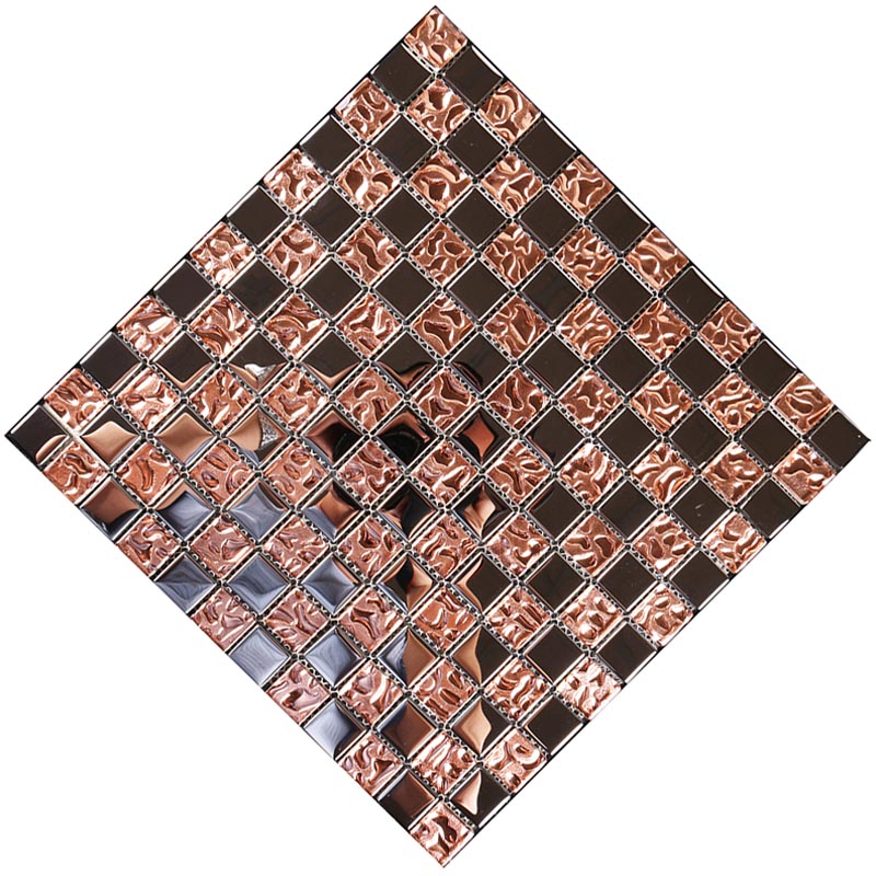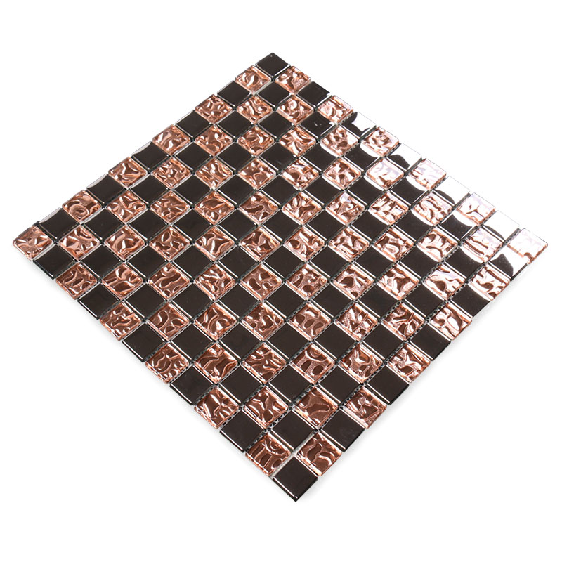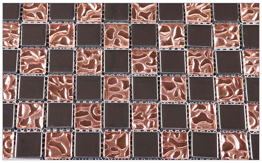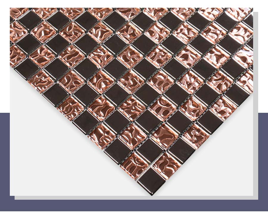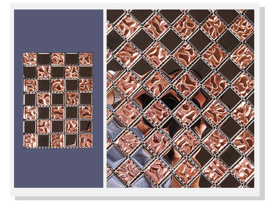 On the back of our product, it is mesh mounted so is easy for cutting. The main color of this tile is rose gold and silver. There is a special water wave design on the back of the rose gold chips. The silver chips and the rose gold chips put together are simple but unique. It is a modern style which is a deluxe decoration. It is especially recommended for the kitchen backsplash, fireplace, mirror wall decorated.